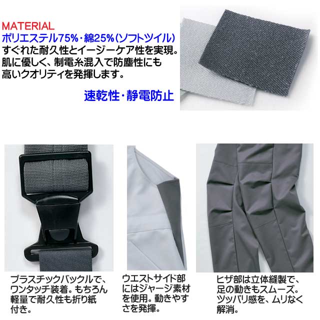 ・カラー :77スミグレー 37シルバー ・素材 :ポリエステル75%・綿25% [特徴] ワンタッチ装着のプラスチックバックル 胸ポケット付(マジックテープ仕様) 両脇フライス仕様(ウエスト) ヒザ部分立体縫製 ※取り寄せ商品、在庫の有無と納期は後日連絡