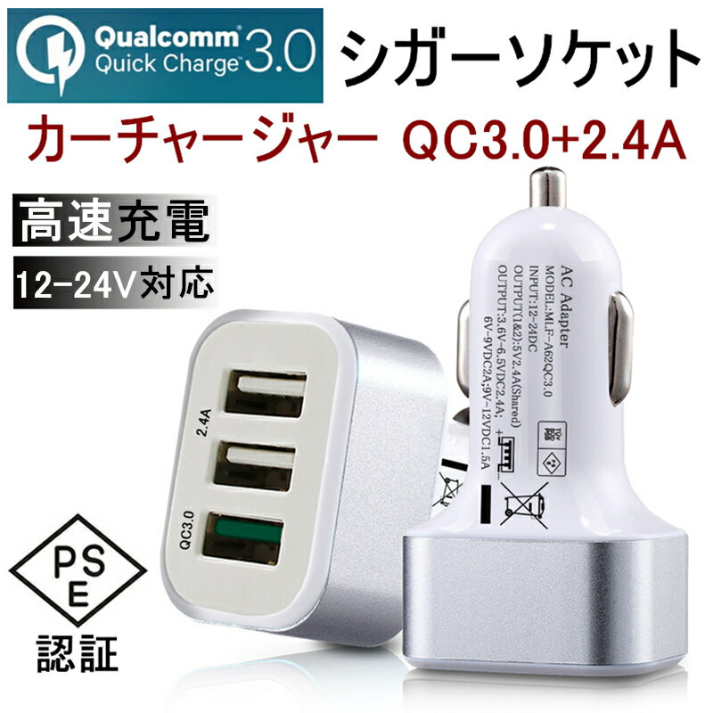 Quick Charge 3.0 カーチャージャー ACアダプター USB急速充電器 2.4A超高出力 USB3ポート 高速充電 車載用 電源アダプター スマホ充電器 ACコンセント PSE認証 送料無料